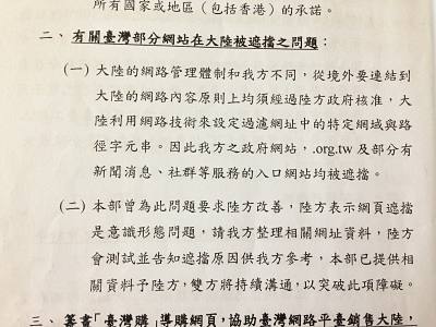 經濟部在近期立院報告中表示,台灣「部分有新聞消息、社群等服務的入口網站均被遮擋⋯⋯本部曾為此問題要求陸方改善,陸方表示網頁遮擋是意識形態問題,請我方整理相關網址資料,陸方會測試並告知遮擋原因供我方參考」,對中國網路屏蔽台購物網站顯然無可奈何。有立委抨擊此因台灣做為民主國家,無法以反屏蔽淘寶網反制中國,雖然此提議有強烈以牙還牙精神,卻也點明了因台灣電商蒙受的損失是巨大的「民主貼水」。