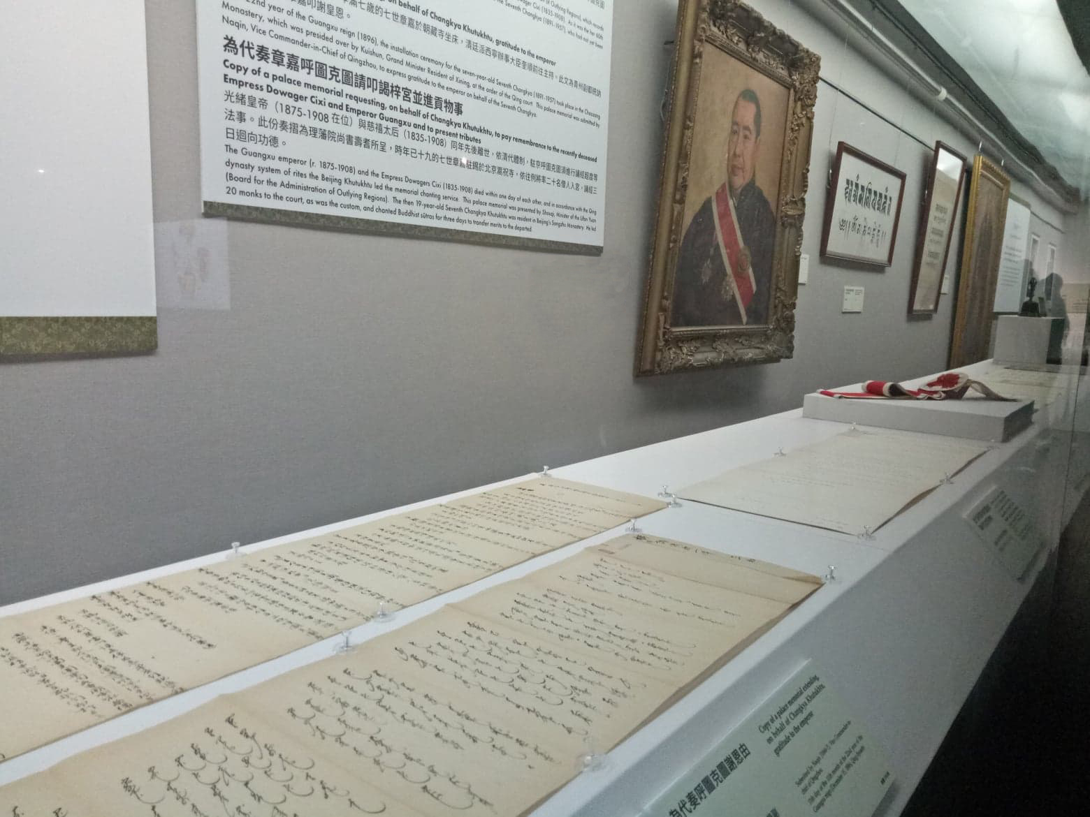 去年十一月開始,在國立故宮博物院展出的「呼畢勒罕—清代活佛文物大展」從藏傳佛教裡特殊的「轉世制度」出發,透過文物展示,討論近代以來與宗教相關的歷史。借展單位包含了文化部蒙藏文化中心、國家圖書館…等公、私機構與藏家,從入口處的轉經輪模型開始,對於章嘉呼圖克圖的傳承多有著墨,在相關文物外,另外展示了遷居台灣的第七世章嘉呼圖克圖在世時與友人如嘉樂頓珠(第十四世達賴喇嘛的家族成員)、于斌樞機主教的書信。