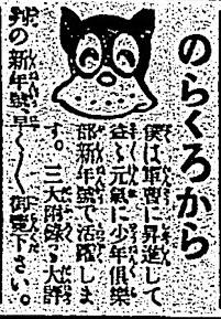 《少年俱樂部》1934年新年專刊廣告,內容為野良犬黑吉已晉升至軍曹。 |
