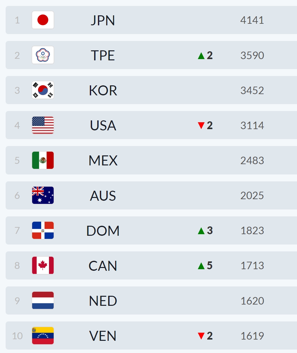 國際棒壘球總會(WBSC)在2021年6月28日公布新的世界男子棒球排名,台灣首度竄升至世界第二,僅次於日本,贏過韓國、美國、多明尼加等世界棒球列強,在這一期的排行中,擁有超過10位現役大聯盟球員的波多黎各,連前10名都沒有排進去。