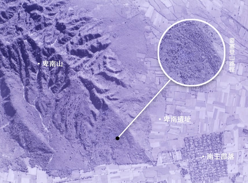 卑南山,又稱檳榔四格山,本意卑南族語中緩緩而上的斜坡之地(一說為種植檳榔樹之地)。地形上是卑南溪沖積而成的河階地,持續抬升後形成一座小山。此山雖不高,僅有400公尺出頭,卻是一個視野良好的獨立小丘。跟據〈獨立混成第百二旅團台東地區陣地要圖〉所標記,山頂上除有步兵大隊本部、機關槍中隊駐守,配有大量坑道,以及輕機槍、迫擊砲、防空砲等陣地,另有野戰砲兵工事,射向對準台東飛行場。