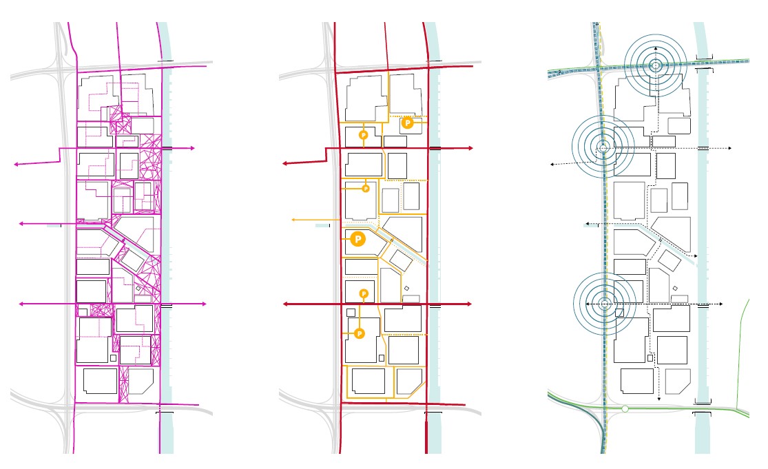 第二,透過空間上針對商業、住宅區域的劃分,可以進一步將基地內的交通做出車種分流。由下圖可以看出:最為密集的粉紅色的人行道路(左一)讓行人能輕鬆且無礙地穿越整個社區基地;為了保證住戶日常通勤的便利性,紅色橙色的自行車道、自行車停車場(左二)以及綠色的大眾運輸(左三)被安排以適當的距離設立、作為配套系統,讓住戶可以利用自行車快速地到達公車或火車的轉乘點。