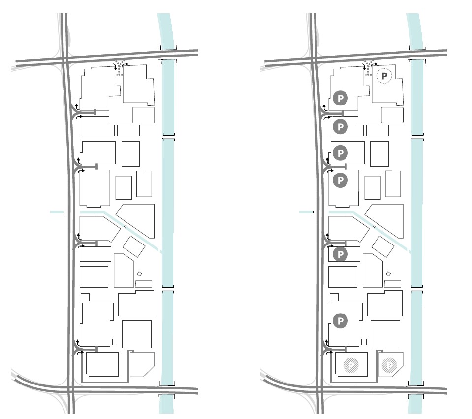 另一方面,為了降低民眾對於汽車的依賴度,住在Merwede社區的居民無法將自家的汽機車直接駛至家門前,必須要將汽車停放於附近的地下停車場,再透過自行車、步行完成回家的最後一哩路。如下圖中可以看到的,可供機動車停駛的道路(黑色線條)以及停車場(圓形P字符號)僅位於部分辦公大樓之間,是社區中少數為汽機車提供服務的道路。