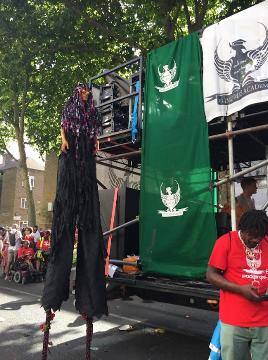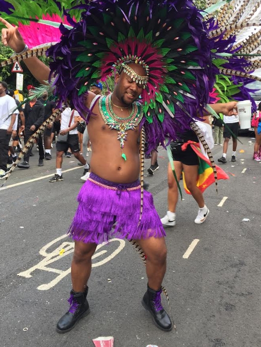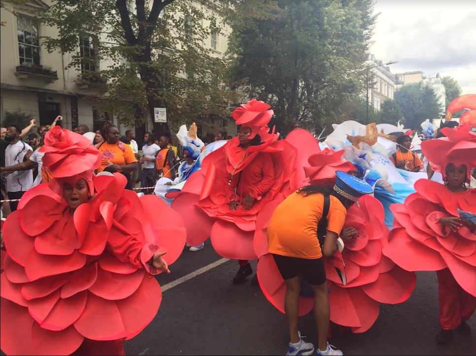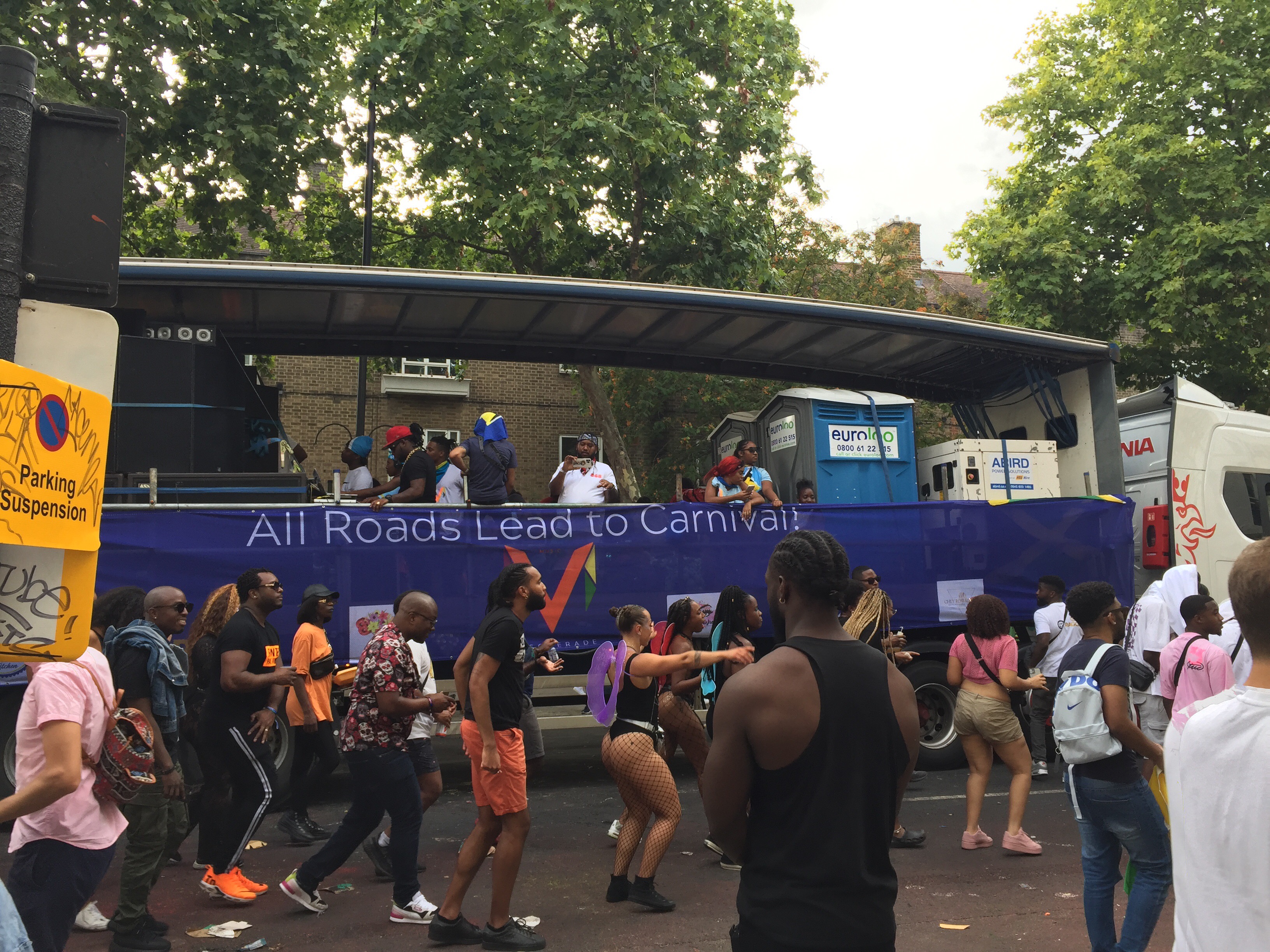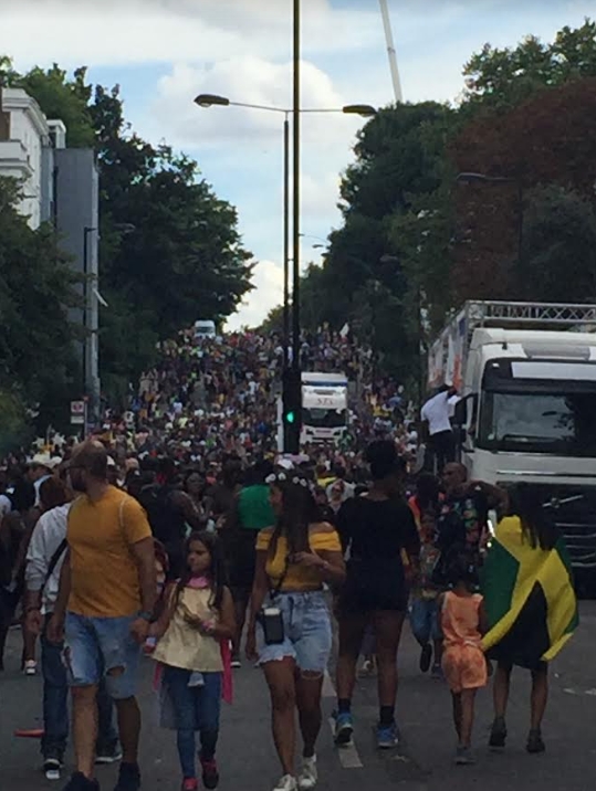依照慣例在八月最後一個weekend bank holiday,第一天周日是兒童狂歡日,這是個家人和學校老師出動的日子,重視教育與傳承,今年湧來了 1.4百萬人;第二天周一是成人狂歡日,這是個擁抱不同文化的人,不管是獨裁是貧窮,大家就在當下大街小巷跳舞狂歡,今年湧來了2百萬人。 與會的人們,個個裝扮得花枝招展,在大街小巷,隨著大卡車音樂飆舞鬥舞;Calypso是加勒比群島上,流傳的一種即興諷刺歌,每每根據時政和社會熱點,改寫歌詞,曲調輕鬆幽默,歌詞俏皮好玩;鋼鼓的振動,響亮得足以讓人感受到拍子,不知不覺地「心受驚」「肉跟跳」,不管老少,不管男女,不管膚色,留守的居民也在自家陽台開趴,連穿制服的警察也情不自禁地,隨之搖身擺頭,人們是那麼地完全融合,那麼地純粹快樂,誰說快樂是需要花錢買的?!