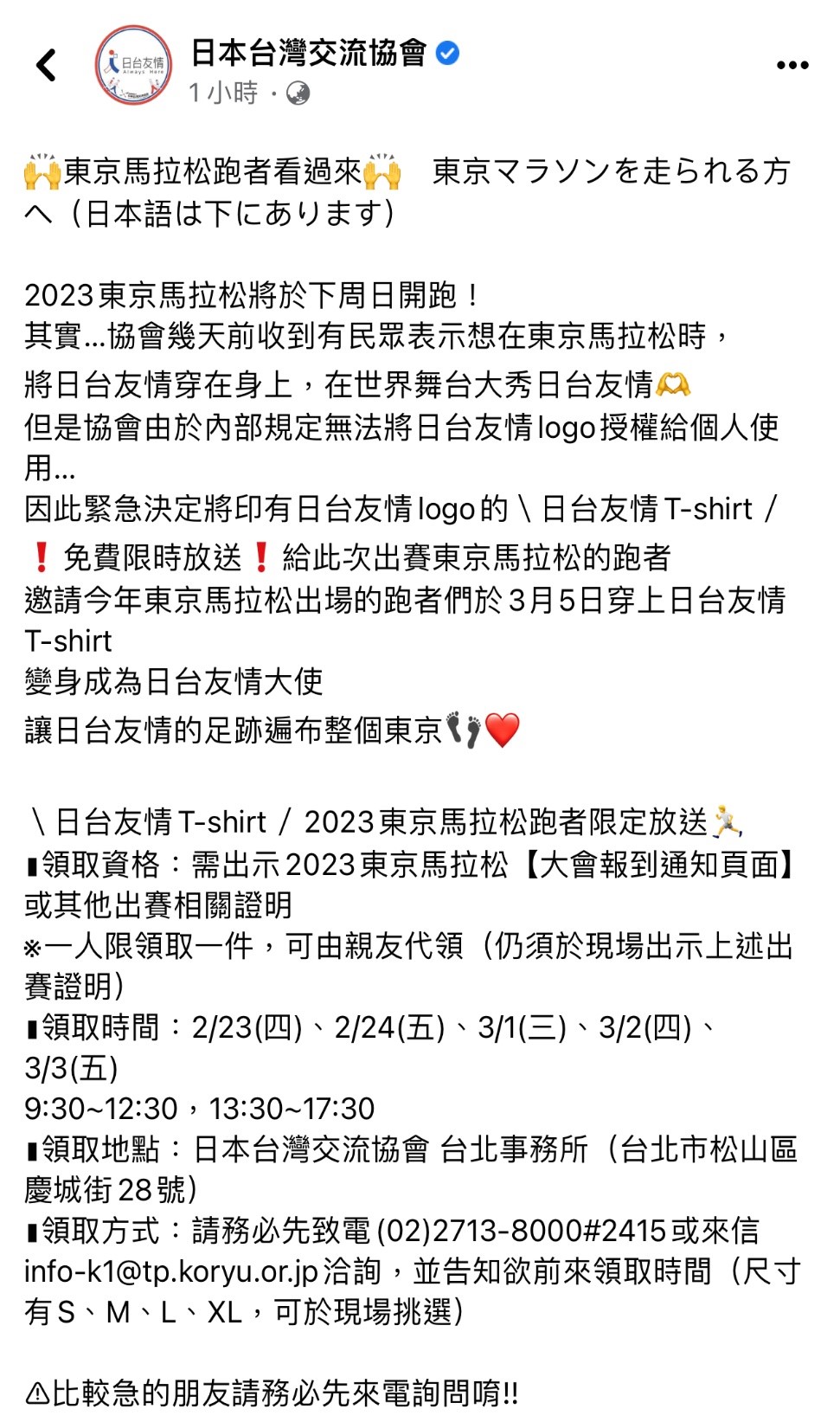 在此之前、日台交流協會在2月22日曾在臉書公布參加今年東京馬拉松的選手可得日台友情T-Shirt一件,主因是有今年的跑者曾經跟日台交流協會表示想要請其授權使用日台友情logo在今年東京馬拉松使用,但因為日台交流協會內部規定表示不方便,而改直接大方贈送T-Shirt,雖說是限量贈送,但發文不到兩個小時就全部送完,日台交流協會也沒有想到台灣人參加東京馬的人數會這麼多吧。