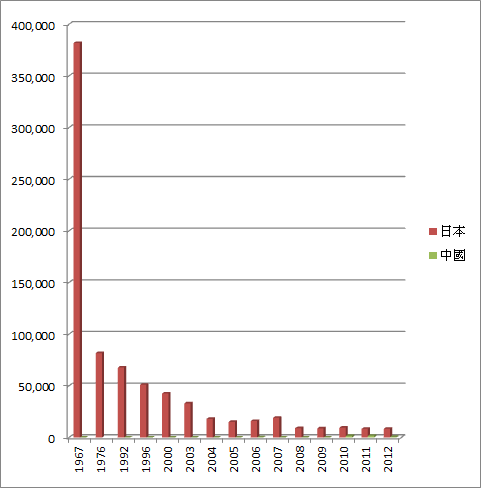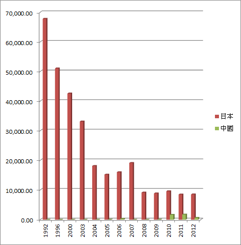 表一:1967-2012台灣出口到日本與中國的香蕉(單位:噸)。