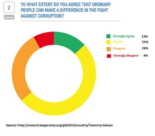 這圖中有趣的是,覺得無力改變的人共有 36% ,恰巧與行賄貪腐的數字 36% 相符合。是否人一旦必須要跟黑暗的貪腐共行之後,就對改變毫無期許了呢?但同時間,我們看到的是 64% 的人相信改變是可能的。也就是說,在如此低迷的大環境下,我們超過一半的人,仍然對改變這一切抱有希望。就讓我用一句魔鬼終結者的臺詞來結束,「你不知道你自己有多重要,若你在聽,你就是反抗的一部份」。