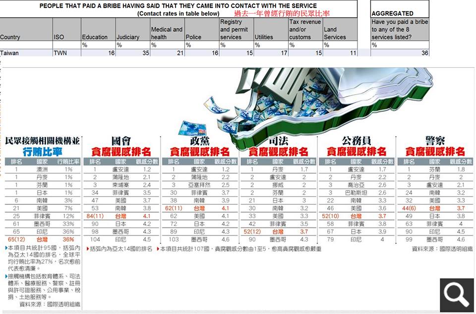 國際透明組織公布2013年全球貪腐(corrupt)指數,台灣民眾在調查前十二個月內曾經向教育、司法、醫療、警政、戶政、日常設施、稅賦、土地服務等單位賄賂(bribe)的比率高達36%,在亞太14國排第12名,在全球95國排第65名。