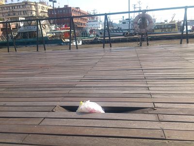 如下圖筆者拍攝所示,基隆市民偶而還會貼心地把吃剩早餐的垃圾放在斷板處,藉此提醒國內外遊客這座木棧平台是刺激的成人娛樂設施,若一個不小心,下面可是深邃的基隆港灣。基隆市民暖暖的互助心與人情味,由此處彰顯無疑!