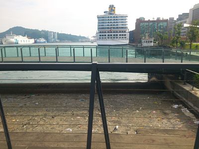 到了海洋廣場後,朝基隆夜市方向望去,遊客可看到一座雅致新穎的景觀玻璃橋。按照官方說法,這座短橋與廟口市區景點串連,供遊客在上面看海景、觀郵輪、談情說愛、散步漫遊之用。可惜的是,就跟國內政府規劃的許多公共工程一般,想像與落差甚大。政府官爺們似乎只知道花錢蓋橋,忘了橋下的環境整潔也是很重要滴。
