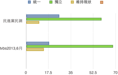 民進黨在6月做了個民意調查。結果查出民眾認同台灣獨立的高達59%,統一的才 25.9%。假使對民進黨做的民調質疑,那麼參考tvbs做的好了,同一個月,tvbs調查結果是:民眾認同獨立的更高,達到了68%,統一的才 18%。