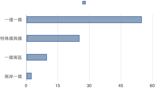 認為一邊一國的最多,高達54.9%,其次是特殊國與國關係,25.3%,這兩樣加起來,達80.2%,這和不同意兩岸一國的78.4%差不多;至於認為兩岸是一個國家,不論是一國兩區或兩岸一國的都少,加起來才12.3%而已,這也和同意兩岸同屬於一個國家嗎的15%接近。