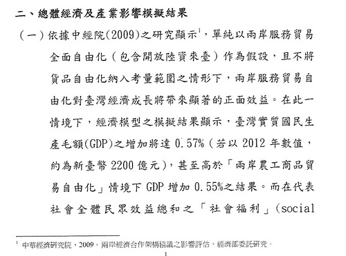 15日公布,由中華經濟研究院所做的「兩岸服貿協議經濟影響評估報告」顯示,服貿協議生效後,將使台灣實質GDP增加9700萬到1.34億美元,成長率為0.025~0.034%之間。