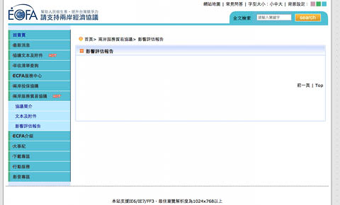 你看出什麼了嗎?是的,我跟你一樣什麼都沒有看到。這是7月16日早上的網頁截圖,但它根本不應該長這樣。7月15日,中經院所做的第二次服貿協議經濟影響評估報告已經出爐,當晚原本已經放上ECFA官網,但在數字過低、效益不如預期的一片罵聲下,16日早上就已被偷偷撤下