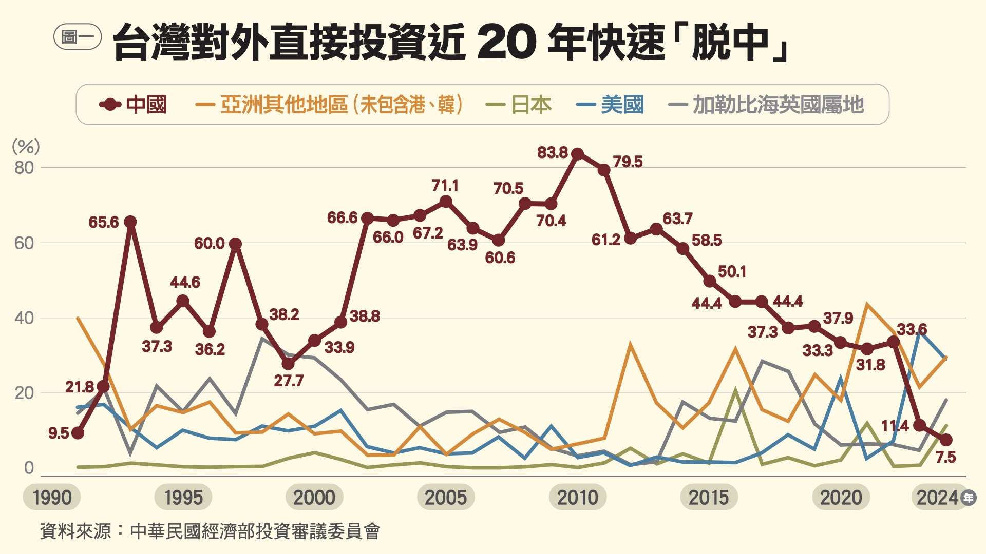 在國際變局與國內政策協力下,台灣的對外投資已經從西進轉向南北軸線,對中投資占FDI總額下降到2024年的7.5%,雖然台商有時會繞道免稅天堂投資中國,將此地區加入後,合計仍只有近兩成,對中國的經濟依賴顯著降低。