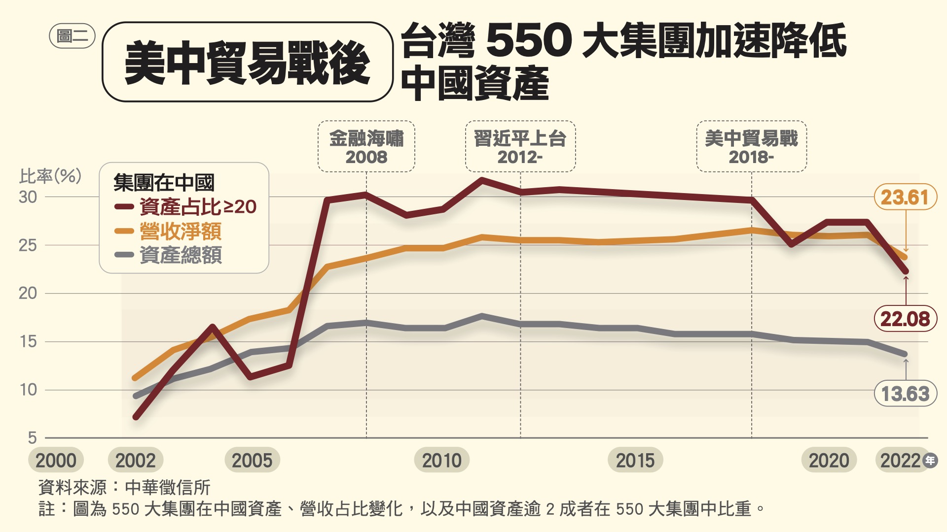 如圖2所示,台灣550大集團中國資產部位總體呈現下降趨勢,在2022年仍有13.6%。我們將台資企業分成中國資產占比超過兩成(例如鴻海)、以及中國資產少於兩成(如台積電)的兩大類,在2010年超過兩成的集團在550大之中占了32%,如今下降到22%,美中貿易戰後降幅最明顯。由於鴻海旗下的富士康集團就占了550大集團在中國合計營收的三分之一,因此2022年中國資產2成以上的台灣大型集團,在中國營收仍占到他們總營收的23.6%。