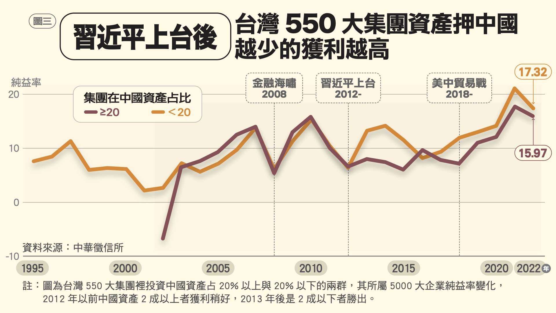 整體而言,台商在中國的營收與獲利,自習近平時期起明顯下滑,沉入投資愈大、對中依賴愈高者,平均績效低於其他企業。圖3 顯示在2012年之前,持有中國資產大於總資產兩成者,其純益率略高於其他企業,但是在2013年之後,除了2016年的例外,每一年都是中國資產少的那一組純益率較高。應該提醒讀者的是,台商在中國的資產持續減少,因此留在中國的投資是還賺錢的部分。另一方面,圖中尚未顯示的是,在2022年,台商南向投資的純益率超過了中國純益率。