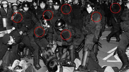 除了「黑衣人」,我實在想不出任何可以更精確描述他們的用語。他們一身黑衣黑褲,頭戴黑色頭盔,看似一身警用裝備,但我們在他們身上找不到任何警徽...