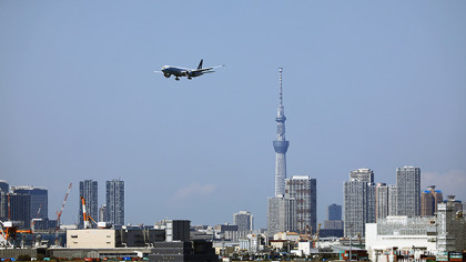 2月2日下午四點多,東京都心的池袋、新宿與大井町等地,人來人往的民眾,突然被一陣吵雜的噴射客機引擎聲吸引,隨後便看到龐大的客機身影出現在天空...