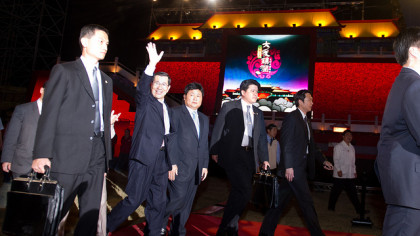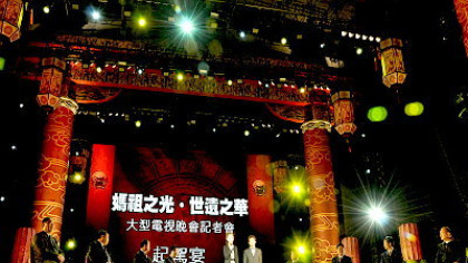 天色暗了下來,外藍內紅兩道LED燈光,替偌大的舞台框出了背景。亮黃色的「祈福」兩個大字正正地落在背景中央,一旁略小的四個字「媽祖之光」...