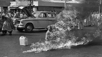 一位僧人坐在西貢市區十字路口,全身被熊熊烈火吞噬,肌肉急速收縮轉而焦黑,但他面容安詳始終靜坐著,與周圍的哀號呈現高度反差...