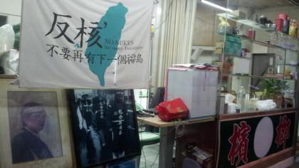 晚上經過萬華一家檳榔攤,玻璃窗掛上了反核的旗幟,我對這面時常見於文青咖啡館、文青書店的旗子並不陌生,但這裡是「檳榔攤」。我停下來,旗子下有兩張照片...
