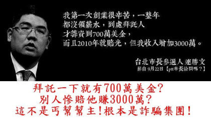 年底大選進入緊鑼密鼓階段,居於劣勢的連勝文頻頻出招恐嚇選民。 10月16日,連勝文聲稱如果他敗選,將會衝擊台灣的產業與金融。10月21日...